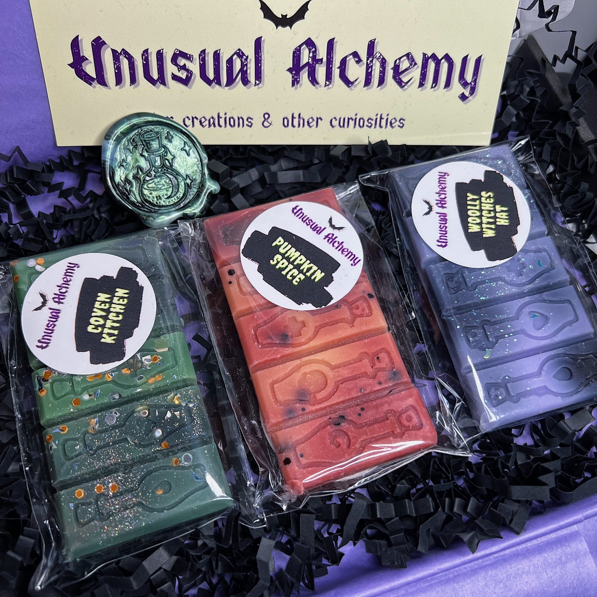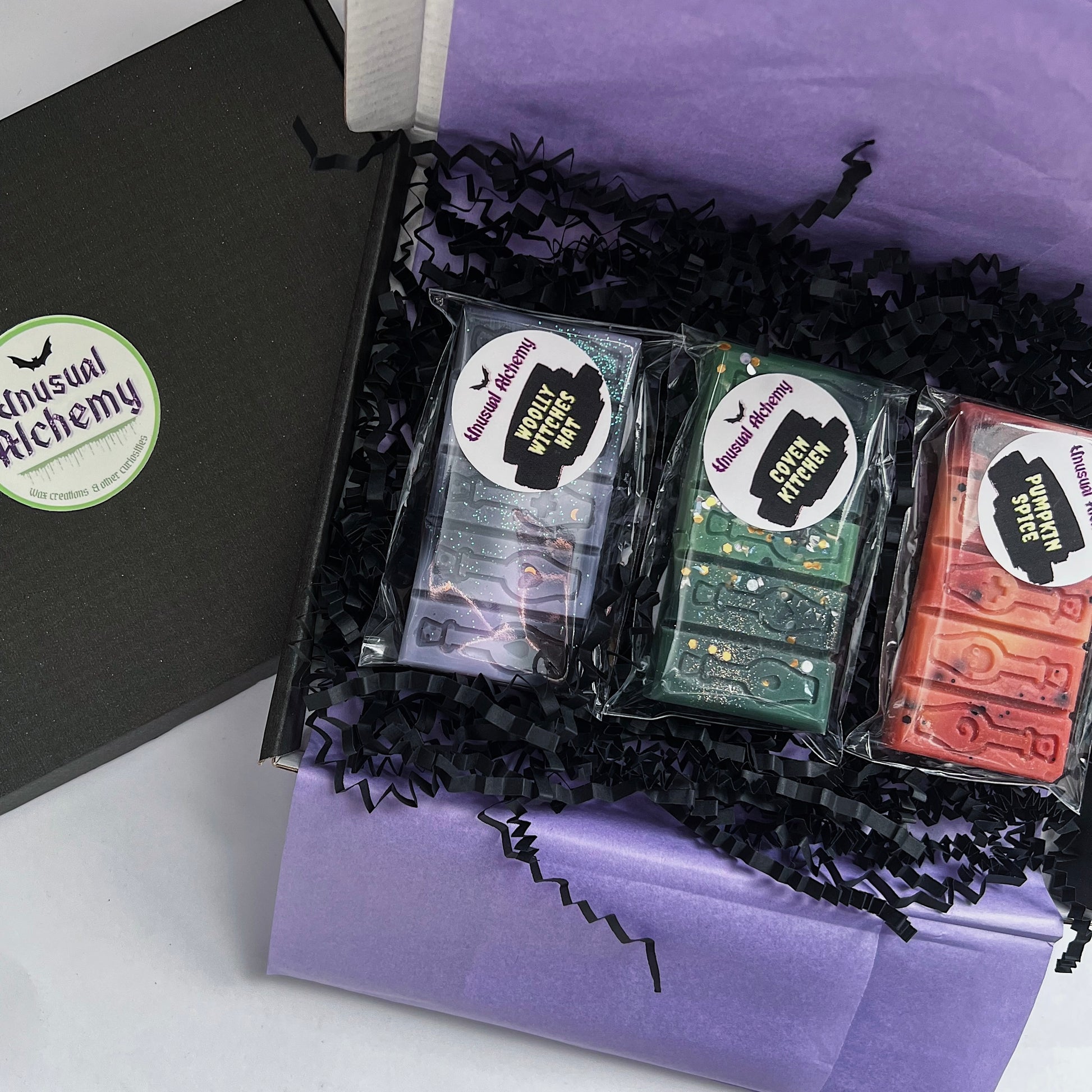 You get 3 potion bottle snap bars in your choice of our limited edition Autumn & Halloween scents and 2 unscented tea lights.