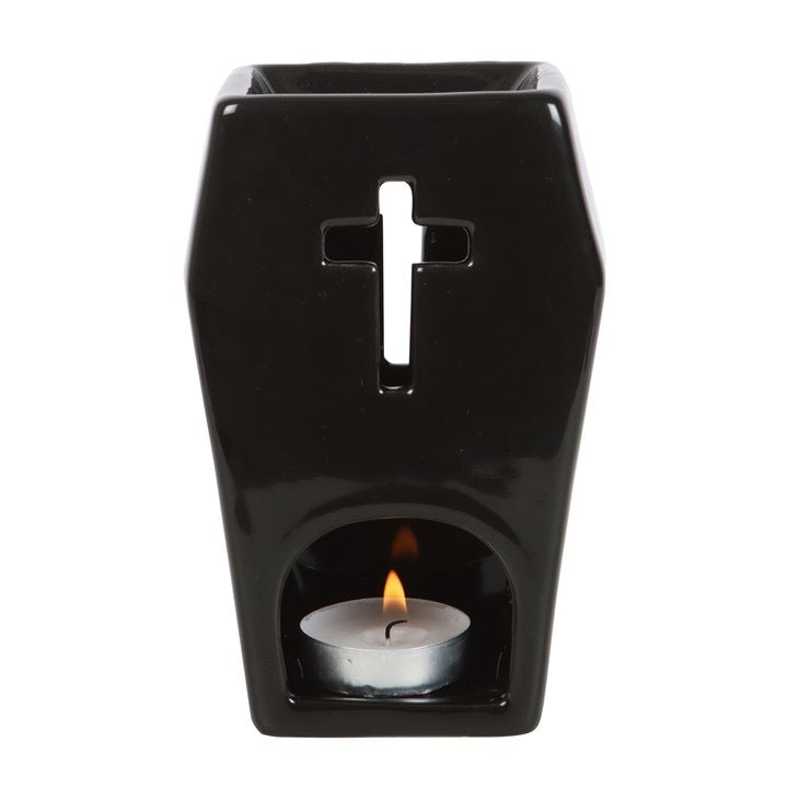 This unique coffin oil burner is perfect for those who appreciate gothic style and unconventional decor. When a lit tealight is placed inside, the cut out cross design is illuminated, casting ambient light and shadows around the room. A great statement piece for the home