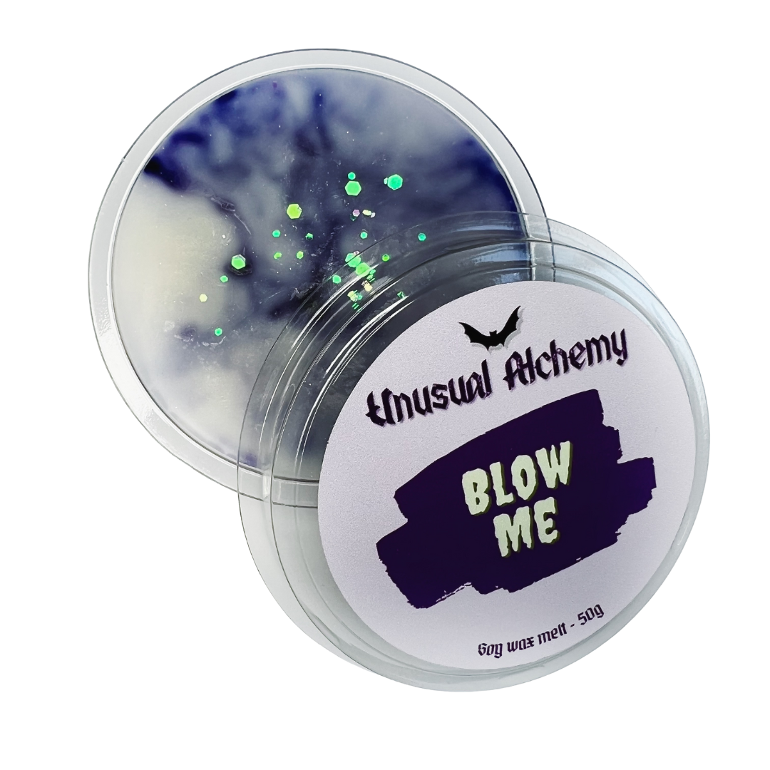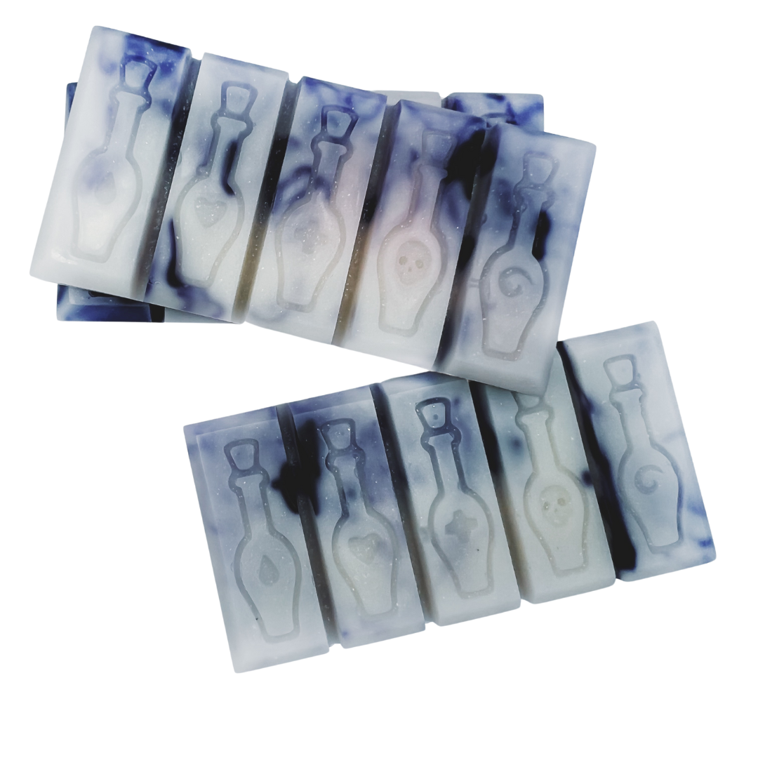 Soy wax snap bar displaying potion bottle designs & packaged in a biodegradable sleeve.