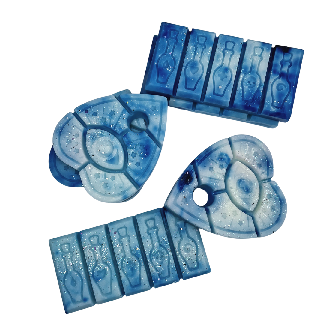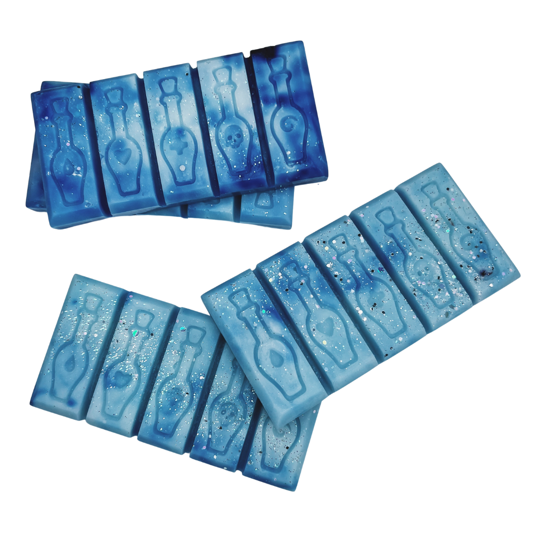 Soy wax snap bar displaying potion bottle designs & packaged in a biodegradable sleeve.
