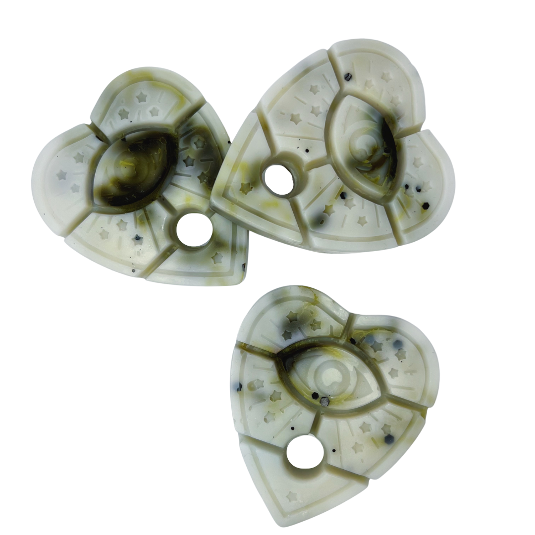 Soy wax snap bar shaped as a traditional planchette & packaged in a biodegradable sleeve