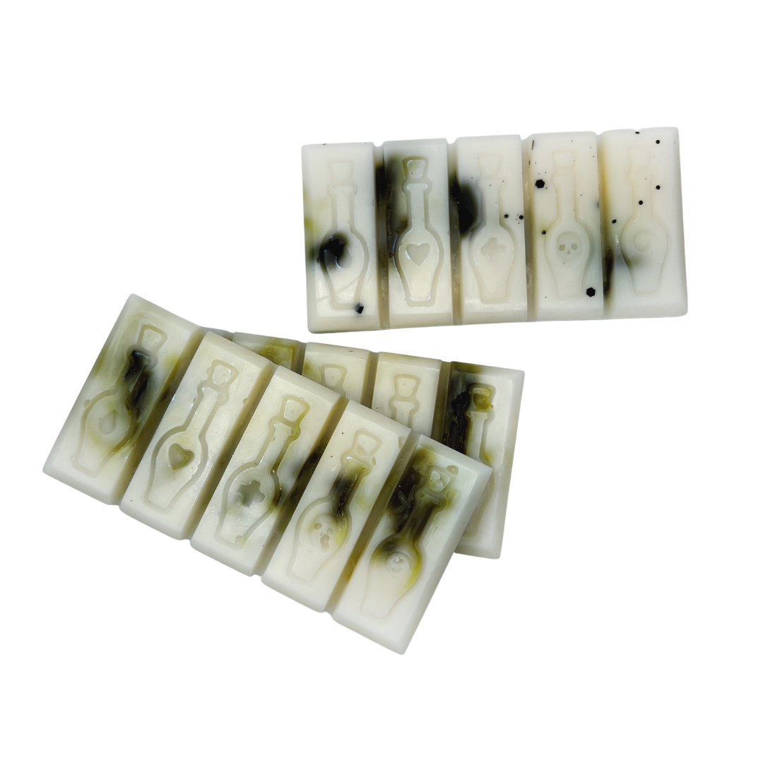 Soy wax snap bar displaying potion bottle designs & packaged in a biodegradable sleeve.