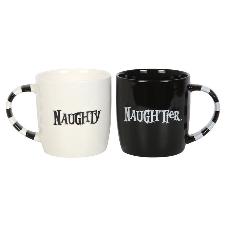 This creepy take on classic Christmas features 'Naughty' and 'Naughtier' text with matching back and white striped handles. Perfect for troublemaking couples and wicked pairs!