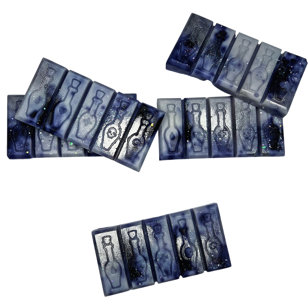 Soy wax snap bar displaying potion bottle designs & packaged in a biodegradable sleeve.