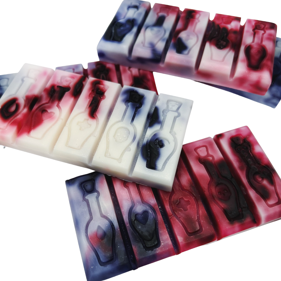 Soy wax snap bar displaying potion bottle designs & packaged in a biodegradable sleeve.