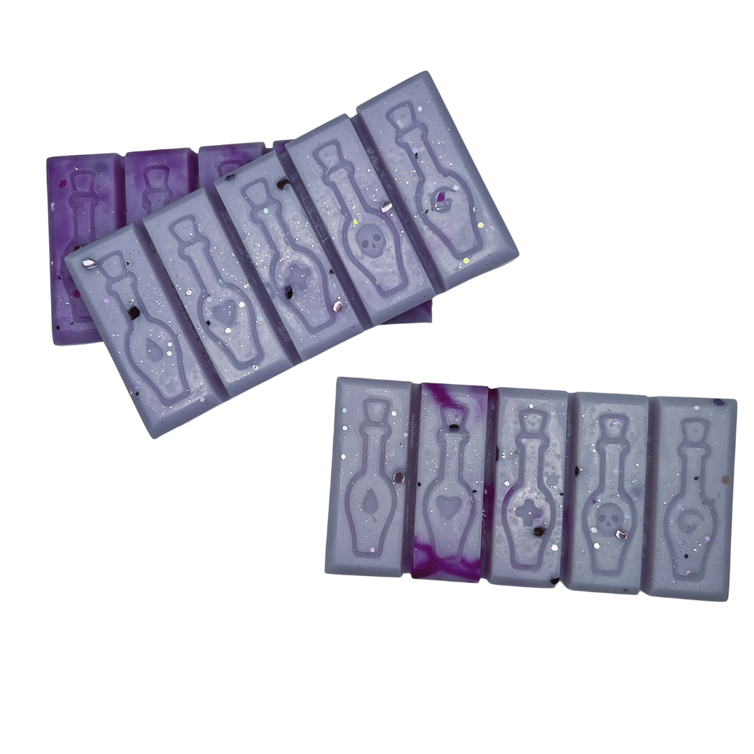 Soy wax snap bar displaying potion bottle designs & packaged in a biodegradable sleeve.