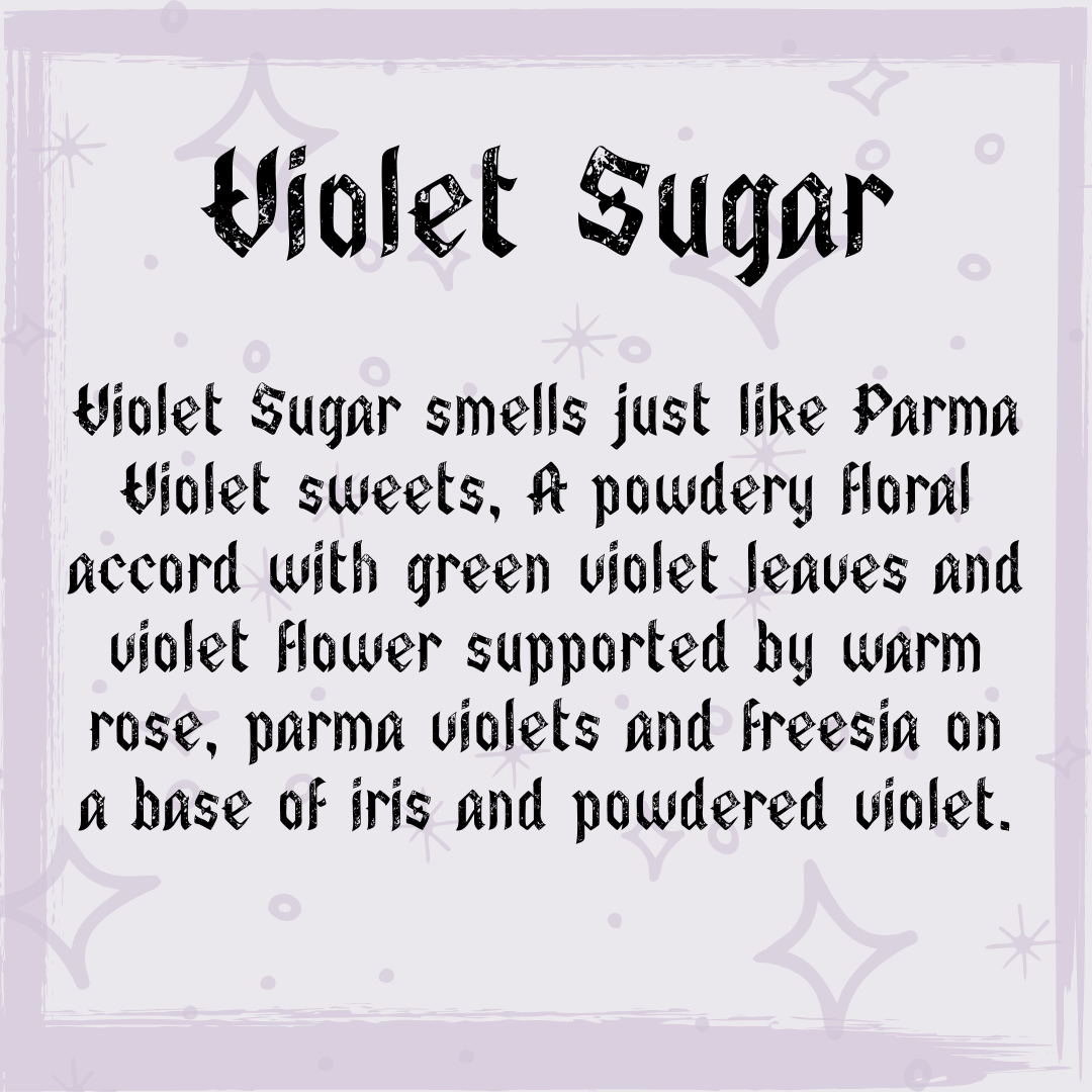 Violet Sugar smells just like Parma Violet sweets, A powdery floral accord with green violet leaves and violet flower supported by warm rose, parma violets and freesia on a base of iris and powdered violet.