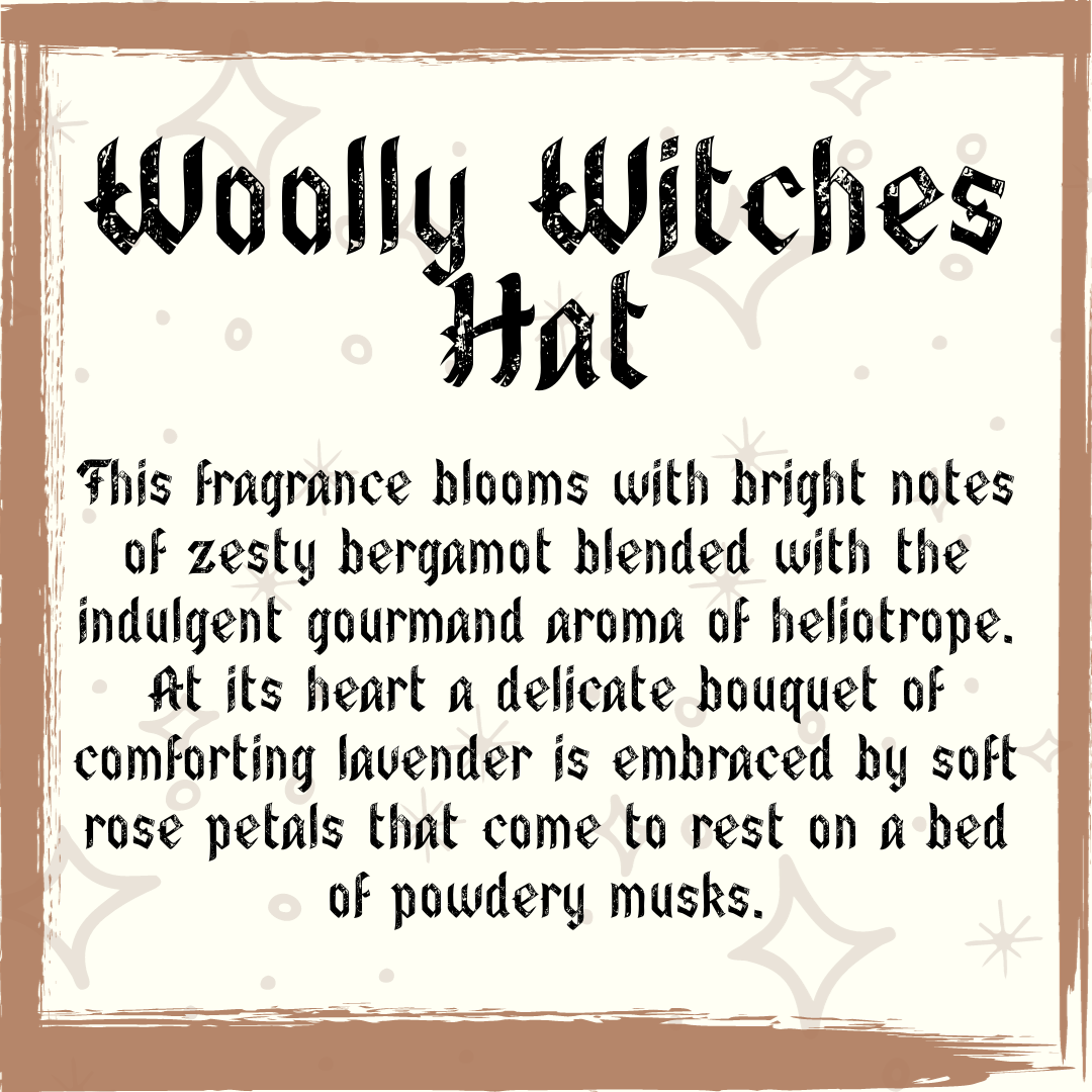 Woolly Witches Hat blooms with bright notes of zesty bergamot blended with the indulgent gourmand aroma of heliotrope. At its heart a delicate bouquet of comforting lavender is embraced by soft rose petals that come to rest on a bed of powdery musks.
